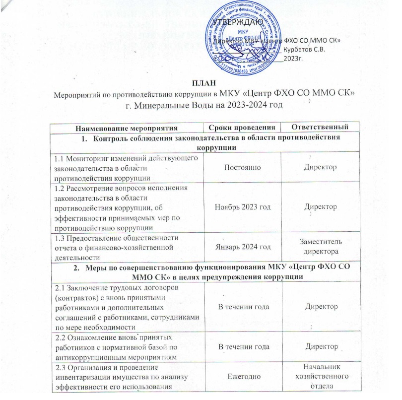 подразделы текущего раздела План мероприятий по противодействию коррупции в Муниципальном казенном учреждение «Центр финансово-хозяйственного обеспечения системы образования Минераловодского муниципального округа Ставропольского края» г. Минеральные Воды на 2023 - 2024 год